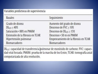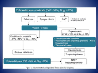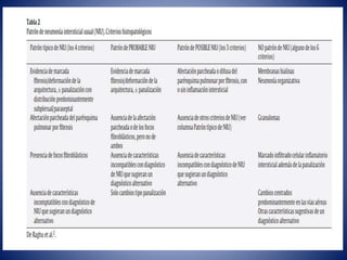 Este documento describe diferentes enfermedades intersticiales idiopáticas y del parénquima pulmonar inferior. Incluye conceptos, manifestaciones clínicas, exploraciones complementarias y tratamiento de condiciones como la fibrosis pulmonar idiopática, neumonía intersticial no específica, neumonía intersticial aguda, bronquiolitis respiratoria asociada a enfermedad pulmonar intersticial, neumonía intersticial linfocítica, linfangioleiomiomatosis, proteinosis alveolar y microlitiasis