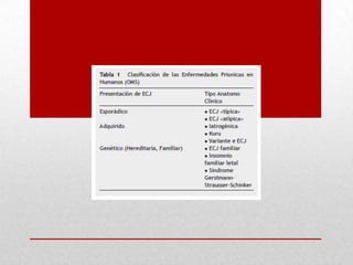 Las enfermedades priónicas son trastornos neurodegenerativos transmisibles causados por proteínas priónicas mal plegadas, que inducen cambios en las proteínas normales y provocan síntomas como demencia, ataxia y trastornos psiquiátricos. Aunque se conocen varios tipos de encefalopatías espongiformes, la enfermedad de Creutzfeldt-Jakob es la más común en humanos y presenta un período de incubación prolongado antes de la aparición de síntomas severos. Actualmente, no existen tratamientos curativos, aunque se están investigando terapias potenciales y enfoques farmacológicos para mitigar los efectos de la enfermedad.