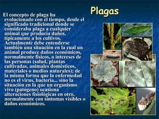 El documento habla sobre plagas, epidemias y pandemias. Define plagas como animales, plantas o microorganismos que causan daños económicos. Menciona plagas agrícolas, forestales y médicas. Explica que las epidemias son enfermedades ampliamente extendidas en una población, mientras que las pandemias afectan grandes áreas geográficas. Da ejemplos históricos como la Peste Negra y la gripe española. Finalmente, clasifica las enfermedades en 21 grupos según su sistema afect