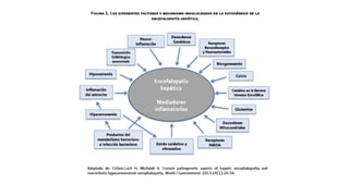 El documento proporciona información sobre el diagnóstico y manejo de la insuficiencia hepática crónica y la encefalopatía hepática. Describe los hallazgos de laboratorio como marcadores de daño hepático y las pruebas de imagen útiles. Explica los síntomas y signos clínicos de la encefalopatía hepática y ofrece recomendaciones para el tratamiento del ascitis, la peritonitis bacteriana espontánea y la insuficiencia hepatorrenal.