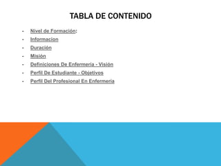 Este documento describe un programa de enfermería de una universidad colombiana. El programa dura 9 semestres y conduce a un título de enfermero. El objetivo es formar profesionales de enfermería comprometidos con el desarrollo humano sostenible y la resolución de problemas de salud. El perfil del egresado incluye habilidades en administración de cuidados de enfermería y desarrollo de investigaciones clínicas y epidemiológicas.