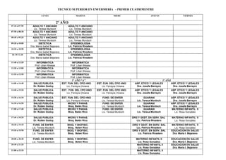 El documento presenta el horario de clases para el primer cuatrimestre de un Técnico Superior en Enfermería. Los estudiantes tomarán clases sobre adultos y ancianos, dietética, epidemiología, informática, aspectos éticos y legales, guaraní, materno infantil, organización y gestión de servicios de salud y educación en salud.