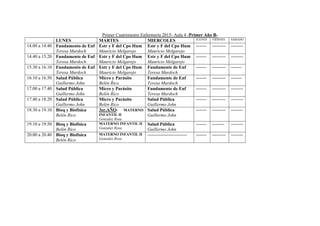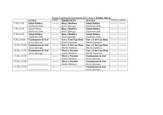 Este documento presenta el horario de clases para los primeros, segundos y tercer años de la carrera de Enfermería en el primer cuatrimestre de 2015. Se detallan las asignaturas y profesores correspondientes a cada día de la semana para los distintos años y aulas.