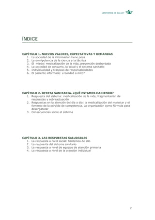 Este documento analiza los nuevos valores, expectativas y demandas en la sociedad y el sistema de salud. La sociedad de la información ha traído prisa e inmediatez, creando demandas de soluciones rápidas. También hay una creencia creciente en la omnipotencia de la ciencia y la tecnología médica. Estos cambios generan demandas que saturan el sistema de salud y dificultan respuestas reflexivas. Se necesita repensar el papel del sistema para adaptarse a los nuevos tiempos de manera saludable.