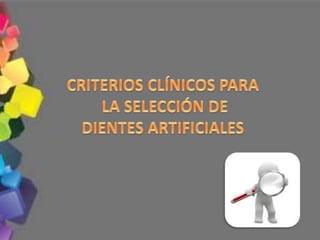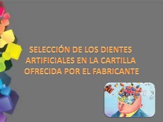 Este documento describe el proceso de selección de dientes artificiales para prótesis dentales totales. Se explican los factores físicos, biológicos y psicológicos que deben considerarse, así como los recursos disponibles y el proceso de medición y selección de dientes en términos de forma, tamaño y color para lograr una prótesis estética y funcional.