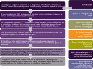 La tomografía computada de alta resolución se ha convertido en el examen de referencia para el diagnóstico y cuantificación del enfisema pulmonar, ya que permite detectar la enfermedad incluso en etapas iniciales y caracterizar los diferentes tipos de enfisema a nivel de lobulillo pulmonar. Los avances tecnológicos en tomografía computada han facilitado el estudio del enfisema leve y su cuantificación a través de la medición del volumen pulmonar afectado.