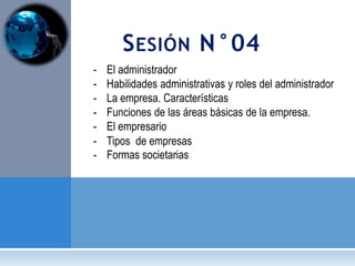Este documento presenta información sobre administración, habilidades administrativas, roles del administrador, la empresa y sus características, funciones, tipos de empresas y formas societarias. Describe tres tipos de habilidades administrativas y los diez roles del administrador según Henry Mintzberg. También explica conceptos clave como empresa, empresario, funciones básicas de la empresa, tipos de empresas según sector, tamaño y forma jurídica, así como requisitos para constituir una sociedad anónima y una sociedad de responsabilidad limit