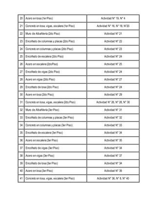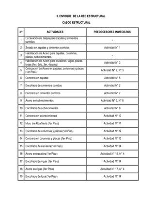 Este documento presenta el enfoque de red estructural para la construcción de un edificio de 4 pisos. Describe 51 actividades requeridas con sus respectivos predecesores inmediatos. También detalla varias restricciones físicas como el espacio limitado de trabajo, la disponibilidad de encofrados y puntales, y la ubicación de materiales que afectarán el desarrollo de actividades. Además, presenta restricciones dadas por especificaciones técnicas sobre la altura de muros por día, tiempos de descenco