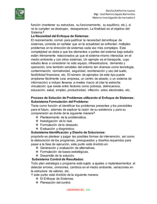 El documento explica el enfoque sistémico y su aplicación para la solución de problemas. Define un sistema como un conjunto de elementos interrelacionados que interactúan dinámicamente para lograr un objetivo común. Explica que el razonamiento sistémico es necesario debido a la complejidad creciente de los problemas actuales. Finalmente, detalla el proceso de solución de problemas mediante el enfoque de sistemas, el cual incluye la formulación del problema, identificación y diseño de soluciones, y control de resultados.