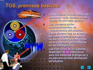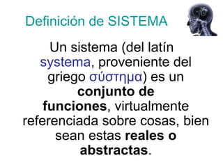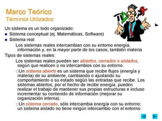 Los sistemas pueden ser físicos o abstractos. Los sistemas físicos están compuestos por objetos reales, mientras que los sistemas abstractos están compuestos por conceptos e ideas. Los sistemas también pueden ser cerrados u abiertos. Los sistemas cerrados no interactúan con el ambiente, mientras que los sistemas abiertos intercambian energía y materia con el ambiente a través de entradas y salidas. La teoría general de sistemas sostiene que las propiedades de los sistemas no pueden describirse solo en