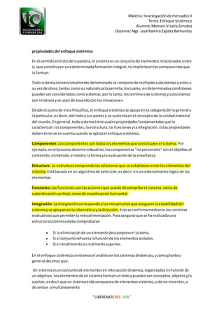 El documento presenta el enfoque sistémico en la investigación de mercados, explicando que un sistema es un conjunto de elementos interrelacionados que funcionan como un todo. Se detallan las características, propiedades y clasificación de sistemas, incluyendo sistemas abiertos y cerrados, así como la importancia de la interacción y organización de los elementos para alcanzar un objetivo común. Se concluye que el comportamiento de un sistema depende de la manipulación de sus componentes en un entorno determinado.