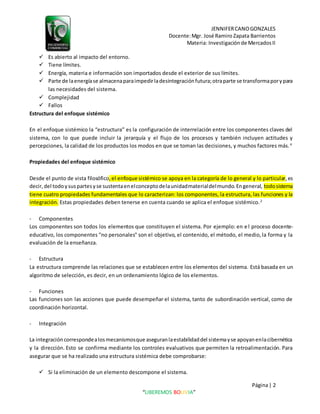 Este documento describe el enfoque sistémico y su aplicación en diferentes contextos. Explica que un enfoque sistémico implica ver los objetos y fenómenos como parte de un todo interrelacionado en lugar de de manera aislada. Luego describe las características y propiedades de los sistemas, incluyendo componentes, estructura, funciones e integración. Finalmente, discute cómo el pensamiento sistémico puede aplicarse a organizaciones y estrategias empresariales para comprender mejor cómo funcionan los sistemas y encontrar puntos de influencia
