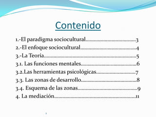 Este documento describe el enfoque sociocultural de Vygotsky sobre el desarrollo humano. Explica que el aprendizaje y desarrollo están influenciados por factores socioculturales. También describe conceptos clave como la zona de desarrollo próximo y la mediación, donde el profesor guía a los estudiantes a través de actividades colaborativas para promover el aprendizaje. El modelo de enseñanza sociocultural enfatiza métodos participativos y de aprendizaje cooperativo para que los estudiantes se apropien de los