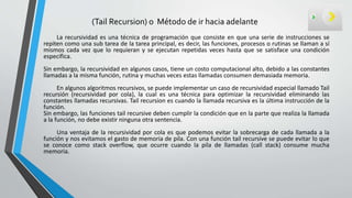 Este documento describe dos enfoques de programación recursiva: recursividad por cola (tail recursion) y backtracking. La recursividad por cola elimina las llamadas recursivas repetitivas para mejorar el rendimiento, mientras que el backtracking genera todas las posibles combinaciones para encontrar una solución, retrocediendo cuando una opción no funciona. También presenta ejemplos como el factorial y resolver un laberinto usando estos enfoques.