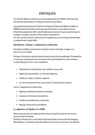 Este documento resume los enfoques y competencias de cuatro asignaturas de educación primaria en México según la Reforma Integral de Educación Básica: Matemáticas, Español, Ciencias Naturales. Describe que Matemáticas se enfoca en la resolución de problemas de la vida cotidiana, Español en comunicación y uso funcional del lenguaje, y Ciencias Naturales en explicar fenómenos naturales y desarrollar pensamiento científico. Cada asignatura busca el desarrollo de competencias específicas en sus estudiant