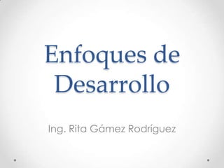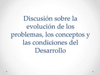 El documento discute los conceptos de desarrollo y crecimiento económico. Explica que el desarrollo incluye avances en áreas económicas, sociales, culturales y políticas de una sociedad. También aborda cómo se ha medido tradicionalmente el desarrollo a través de indicadores económicos como el PIB, y más recientemente a través del Índice de Desarrollo Humano. Finalmente, presenta los diferentes enfoques teóricos sobre el desarrollo como el clásico, marxista, neocl