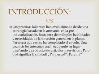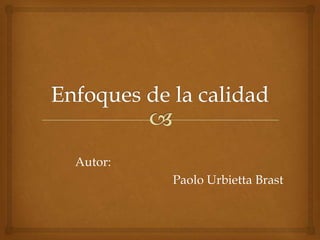 Este documento discute tres enfoques de la calidad: psicológico (trascendente), basado en el proceso, y basado en el producto. También describe los cinco fundamentos de la calidad propuestos por Garvin, incluyendo trascendente, basado en el producto, basado en el usuario, basado en la fabricación, y basado en el valor. Finalmente, explica varios elementos clave de cada enfoque como satisfacción del cliente, procesos, y valor percibido.
