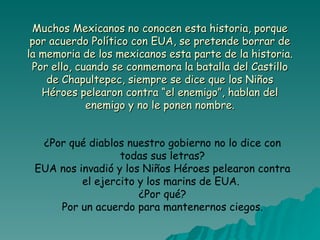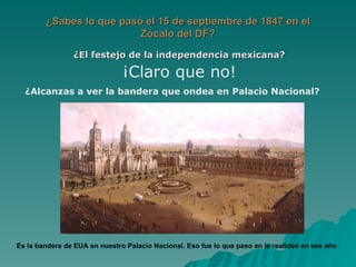 El documento describe cómo Estados Unidos invadió y robó territorio de México en 1847, colocando su bandera en el Zócalo de la Ciudad de México. También critica la pobre educación, infraestructura y corrupción en México, y argumenta que México debería aspirar a ser una potencia de primer mundo en lugar de conformarse con el bienestar. Exhorta a los mexicanos a exigir más de sus políticos y gobierno para lograr un México más próspero y seguro.