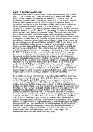 Federico Engels fue uno de los fundadores del marxismo y colaborador cercano de Karl Marx. Juntos desarrollaron las bases teóricas del socialismo científico y el manifiesto comunista. Engels contribuyó a elaborar la filosofía, economía política y teoría del comunismo científico a través de varios escritos clave como La situación de la clase obrera en Inglaterra.