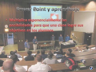 El documento habla sobre Power Point y su uso en el aula. Power Point permite presentar ideas de manera creativa y visual mediante el uso de texto, animaciones, audio, imágenes y video. Su uso en el aula contribuye a actividades creativas de enseñanza-aprendizaje y al desarrollo de las mismas. Se incluye también un ejemplo de uso del pasado simple en inglés.