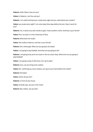 Roberto y Fabian conversan sobre sus actividades del día. Roberto dice que está cansado porque estudió toda la noche, mientras que Fabian solo estudia tres días antes del examen. Fabian invita a Roberto a jugar fútbol esa tarde y Roberto acepta la invitación.