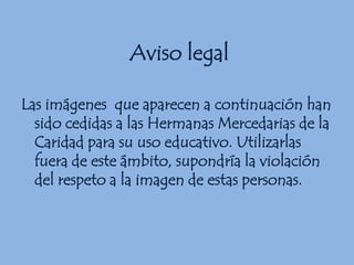 Este documento contiene un aviso legal sobre el uso de imágenes cedidas a las Hermanas Mercedarias de la Caridad solo para uso educativo. Luego presenta un plan de estudios para el curso 2013-2014 enfocado en animar a los estudiantes a involucrarse plenamente en la vida, la alegría, la sencillez y el servicio, que son valores que Dios quiere para ellos. Finalmente rinde homenaje a Sor Isabel Lete Landa, quien vivió feliz sirviendo a Dios con una espiritualidad de alegría y senc