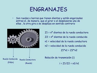 Engranajes son ruedas o barras con dientes que encajan entre sí de tal forma que cuando una gira, la otra gira en sentido opuesto. La velocidad y número de dientes de cada engranaje están relacionados por la fórmula Z1*n1 = Z2*n2, donde Z es el número de dientes y n la velocidad. Esta relación permite calcular la velocidad transmitida y la relación de transmisión entre engranajes.