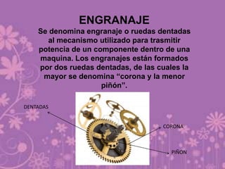 El documento describe los engranajes y poleas, mecanismos utilizados para transmitir potencia en máquinas. Los engranajes consisten en dos ruedas dentadas llamadas corona y piñón que transmiten movimiento de un componente a otro. Las poleas son ruedas acanaladas que, usando una cuerda o cable, cambian la dirección del movimiento o multiplican la fuerza aplicada. El documento también explica la historia, tipos y características de engranajes y poleas.
