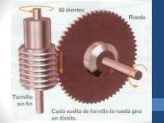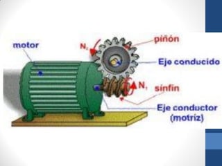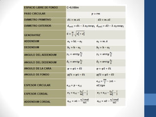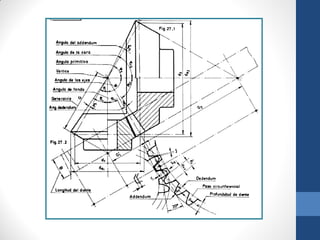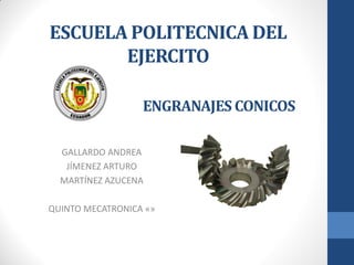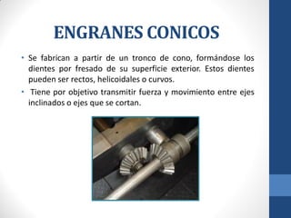 Este documento describe los diferentes tipos de engranajes cónicos, incluyendo sus características, partes, cálculos, aplicaciones y ventajas y desventajas. Los engranajes cónicos se utilizan para transmitir movimiento entre ejes que se cortan y pueden ser rectos, helicoidales o hipoides. Cada tipo tiene usos específicos como la reducción de velocidad o la transmisión entre ejes no paralelos. El documento también explica engranajes rectos, cremalleras y el mecanismo piñón-cremallera.