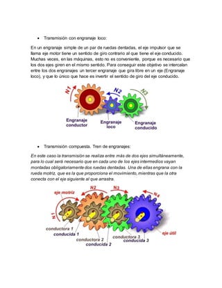 Los engranajes son mecanismos que transmiten potencia entre diferentes partes de una máquina mediante ruedas dentadas que engranan entre sí. Existen varios tipos de transmisión, incluyendo la simple, la con engranaje loco que invierte el sentido de giro, y la compuesta que involucra múltiples ejes. Estas configuraciones permiten conectar ejes motores con ejes conducidos de manera eficiente para realizar trabajo.