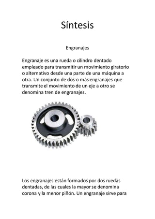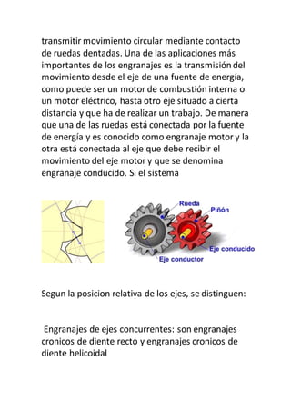 Un engranaje es una rueda dentada que se usa para transmitir movimiento de una parte de una máquina a otra. Los engranajes están formados por dos ruedas dentadas, una mayor llamada corona y una menor llamada piñón. Los engranajes transmiten movimiento circular a través del contacto de sus dientes y se usan comúnmente para transmitir movimiento de un eje motor a otro eje conducido. Existen diferentes tipos de engranajes clasificados según la posición relativa de sus ejes, como engranajes de ejes concurrentes, no coplanarios o par