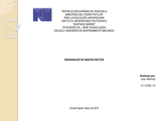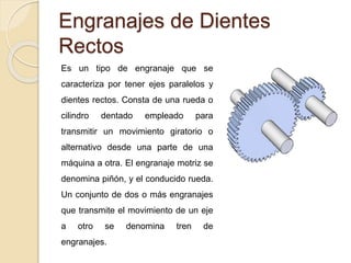 Este documento describe los engranajes de dientes rectos, incluyendo sus características, aplicaciones e historia. Explica que son engranajes que transmiten movimiento entre ejes paralelos mediante dientes rectos. Detalla las partes de un engranaje, como el módulo, número de dientes y ángulo de presión. También presenta ejemplos de su uso para transmitir potencia y velocidad, y los pasos para diseñar engranajes rectos para una aplicación específica.