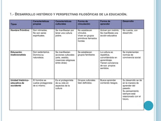 Este documento presenta información sobre una alumna llamada Olvera Rivera Adriana que cursa la materia de Filosofía de la Educación en el grupo M1. Incluye detalles sobre el desarrollo histórico y perspectivas filosóficas de la educación a través de diferentes etapas como la Grecia, Roma, el Cristianismo primitivo y la Edad Media. También describe las características de distintas corrientes filosóficas como el racionalismo, empirismo, realismo e ilustración y su influencia en