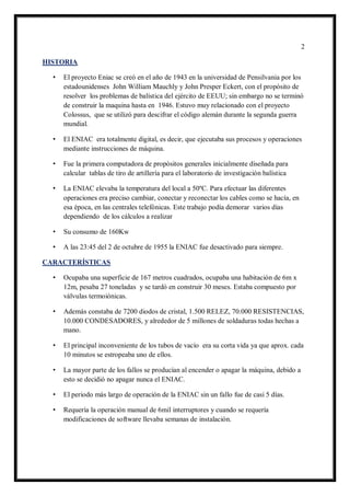 La ENIAC fue la primera computadora digital y programable del mundo, creada en 1946 por John Mauchly y John Presper Eckert en la Universidad de Pensilvania originalmente para calcular tablas de balística para el ejército estadounidense. La ENIAC ocupaba 167 metros cuadrados, pesaba casi 30 toneladas y estaba compuesta de miles de válvulas, resistencias y condensadores. A pesar de ser primitiva, podía realizar 5000 sumas o 300 multiplicaciones por segundo.