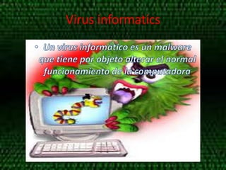 El documento habla sobre diferentes tipos de malware y software de seguridad. Menciona virus, phishing, spyware, adware, spam, antivirus, firewalls y anti-spyware como diferentes amenazas y protecciones de seguridad para computadoras. También define el spyware como software que recopila información de una computadora sin el consentimiento del usuario.
