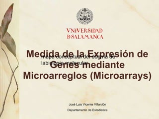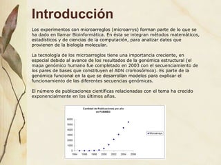 El documento describe el proceso de transcripción y traducción en células procariotas y eucariotas, así como el uso de microarreglos para medir la expresión de genes. Los microarreglos permiten medir los niveles de ARN mensajero de miles de genes simultáneamente, lo que ayuda a identificar genes asociados con enfermedades.