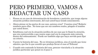 Este documento presenta tres oraciones sobre un caso hipotético de partición de herencia. Describe que el caso involucraba a varias partes con nombres ficticios, y que planteaba una situación jurídica controvertida sobre la cual el autor nunca supo cuál era la respuesta correcta. Relata brevemente la historia del caso, vinculándola a la situación jurídica en cuestión.