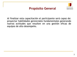 Este documento presenta un taller sobre desarrollo de competencias gerenciales, con un enfoque en el liderazgo transformacional. El taller cubre temas como el rol del líder en el cambio organizacional, tipos de liderazgo, manejo del poder, e inteligencia emocional. El objetivo es que los participantes desarrollen habilidades gerenciales fundamentales para lograr una gestión eficaz mediante el uso de estrategias de liderazgo moderno.