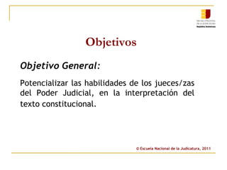 Este documento presenta un curso sobre interpretación constitucional impartido por la Escuela Nacional de la Judicatura de República Dominicana. El curso tiene como objetivo principal potenciar las habilidades de los jueces en la interpretación de la constitución. Cubre temas como los principios, métodos y teorías de la interpretación constitucional, el perfil del intérprete constitucional, y la interpretación de derechos fundamentales. El curso se imparte en nueve módulos a lo largo de tres encuentros presenciales y contiene una evaluación