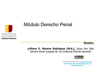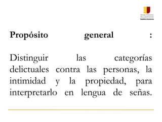 Este documento presenta un módulo sobre derecho penal que tiene los siguientes objetivos: 1) examinar los delitos contra las personas como homicidio y golpes y heridas, 2) identificar los delitos contra la intimidad como violación sexual e incesto, y 3) distinguir los delitos contra la propiedad como robo y estafa. El módulo utiliza métodos como exposición oral, participación de estudiantes y recursos audiovisuales para analizar estas categorías delictuales y casos prácticos.