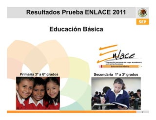 Este documento resume los resultados de la Prueba ENLACE Básica de 2011 en México. Algunos de los hallazgos clave son: 1) La cobertura de la prueba en 2011 fue la más alta registrada con más de 14 millones de estudiantes; 2) El porcentaje promedio de estudiantes con logros buenos o excelentes en matemáticas de primaria aumentó de 17.6% en 2006 a 37% en 2011; 3) Todos los estados mejoraron sus resultados entre 2006 y 2011, aunque Oaxaca y Michoacán tuvieron coberturas