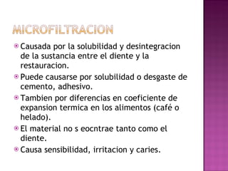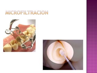 La microfiltración y precolación pueden causar problemas en restauraciones dentales como sensibilidad e irritación. La microfiltración ocurre cuando los líquidos pasan a través de las grietas entre el material de restauración y el diente, generalmente debido a diferencias en la contracción térmica o polimerización. El éxito de una restauración depende de prevenir la microfiltración y precolación. La técnica de grabado ácido es efectiva para sellar las uniones marginales.