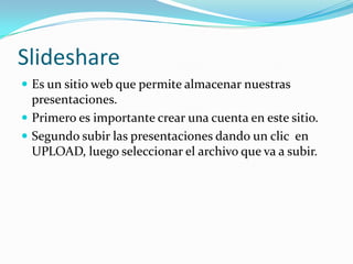 Slideshare es un sitio web para almacenar presentaciones que requiere crear una cuenta y luego subir archivos haciendo clic en UPLOAD para seleccionar la presentación a publicar. El documento también menciona enlazar el blog con Slideshare.