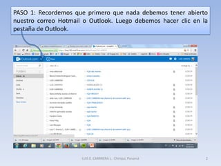 El documento detalla los pasos para crear un enlace corto de un archivo en OneDrive para compartir. Los pasos incluyen abrir Outlook, seleccionar el archivo, activar la opción de compartir, y finalmente crear y copiar el enlace corto. Este método permite compartir fácilmente archivos a través de redes sociales, WhatsApp o correo electrónico.