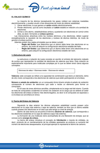 El documento describe los diferentes tipos de enlaces químicos. Explica que los átomos buscan estabilidad ganando, perdiendo o compartiendo electrones para formar enlaces. Describe los enlaces iónicos entre metales y no metales, y los enlaces covalentes entre no metales que comparten electrones. También cubre la teoría del enlace de valencia, la hibridación de orbitales, y las diferentes geometrías moleculares y ángulos de enlace determinados por la repulsión entre pares de electrones.