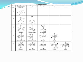 Los átomos se unen para alcanzar la mínima energía posible. Existen diferentes tipos de enlaces como el iónico, covalente y metálico. En el enlace iónico los iones se atraen electrostáticamente formando redes cristalinas, mientras que en el covalente los átomos comparten electrones de valencia. La geometría molecular depende de la teoría de repulsión de pares electrónicos.