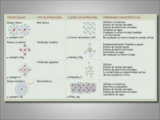 El documento describe los diferentes tipos de enlaces químicos entre átomos, incluyendo enlaces iónicos, covalentes y metálicos. Explica que los átomos se unen para alcanzar una configuración electrónica más estable, compartiendo o transfiriendo electrones. También describe las fuerzas intermoleculares como puentes de hidrógeno y fuerzas de dispersión, así como la teoría de orbitales moleculares para explicar cómo se forman los enlaces a nivel atómico y molecular.