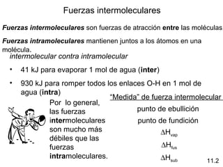 Este documento describe las diferentes fuerzas intermoleculares que existen entre moléculas, incluyendo fuerzas de dispersión, dipolo-dipolo, ion-dipolo, y enlaces de hidrógeno. Explica cómo estas fuerzas débiles entre moléculas dan como resultado los estados condensados de materia como líquidos y sólidos, y cómo propiedades como los puntos de ebullición y fusión reflejan la intensidad de las fuerzas intermoleculares.