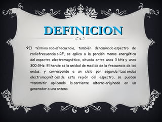 Este documento define el espectro de radiofrecuencia (RF) como la porción del espectro electromagnético entre 3 kHz y 300 GHz, y explica que las ondas de RF se pueden transmitir aplicando corriente alterna a una antena. Luego describe algunos tipos comunes de antenas utilizadas para transmitir señales de RF, como antenas lineales, de radiodifusión y direccionales de televisión. Finalmente, menciona algunas de las principales aplicaciones de las comunicaciones por RF, como la radiocomunicación, radioastronomía y radar
