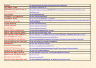 Este documento proporciona una lista de enlaces a recursos y aplicaciones educativas de TIC. Incluye enlaces a bancos de imágenes, sonidos y recursos multimedia; herramientas para editar imágenes y sonidos en línea; plataformas como Moodle y Blogger; generadores de líneas de tiempo, mapas conceptuales y presentaciones; y tutoriales sobre herramientas como Ubuntu, Prezi, WordPress y más. El objetivo es ofrecer una amplia variedad de recursos TIC para su uso en educación.